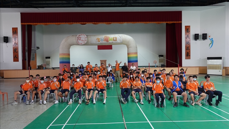 嚴格來說,今天活動的茂林國中跟昨天我們去的桃源國中都在荖濃溪畔,茂林國中在以蝴蝶谷著名的國家風景區內,是一所超迷你的學校,因為每次都是全校一起參加活動,所以我們通常每三年才會巡迴來這裡一次,很少在學校裡碰過參加過的同學,過往我們都是在校門口旁的家扶彩虹屋前打開化學車表演,不過昨天當我們在場佈的時候,警衛叔叔說明天中午過後一定會下大雷雨,我們從十幾年前第一次來茂林時他就在這裡了,他的天氣預報絕對不會錯,所以在他的建議下,主任幫我們借了學校旁社區活動中心的大球場,有個大屋頂遮蔭避雨,上面還有看起來像在辦祭典的彩帶,真是謝謝學校給我們這麼特別的場地使用,果不其然,今天表演到一半,茂林山區就開始降下大雨,同學們完全不受影響,表演很順利的進行著。