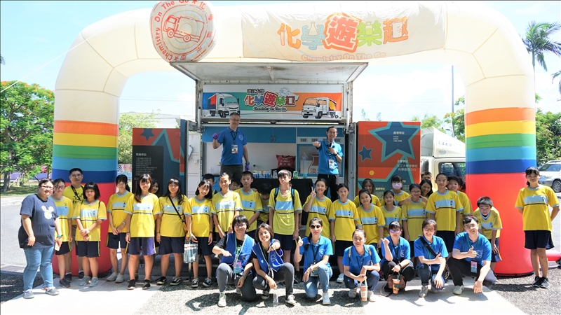 興中國中的師生與淡江團隊一同於化學車拱門前進行大合照