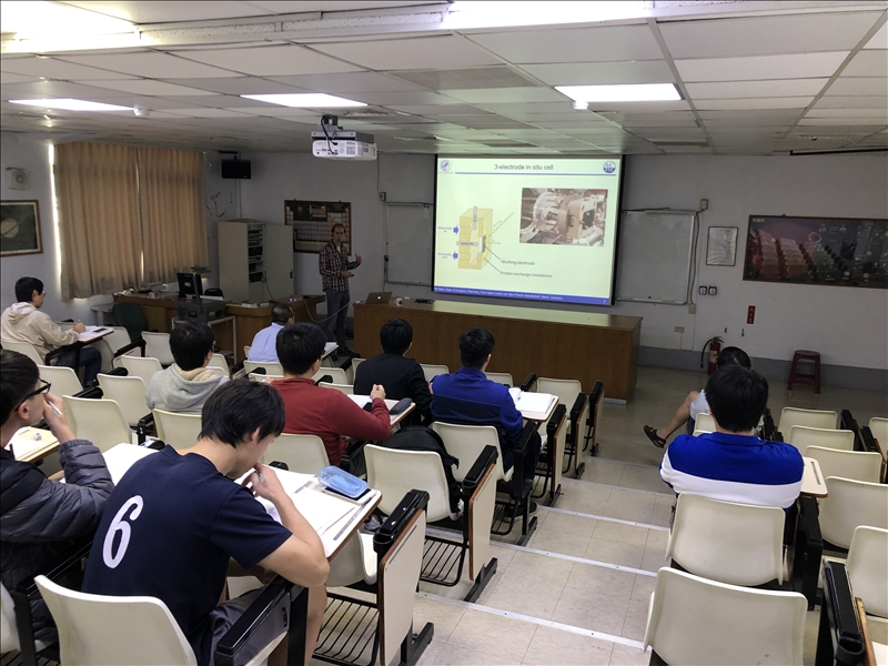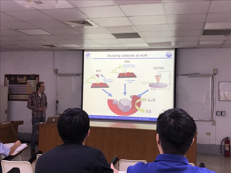 講者Rik Mom博士畢業於荷蘭的萊登(Leiden)大學,現於德國馬克斯·普朗克學會的弗里茨·哈伯研究所無機化學系(Department of Inorganic Chemistry, Fritz-Haber-Institut der Max-Planck-Gesellschaft)從事博士後研究。Mom博士的研究專長為X光光譜實驗,被邀請於11月26日在科學館S215進行一場演講來介紹國際研究中與X光光譜有關的實驗方法並講述與他自己所做與這些光譜實驗相關之研究,題目為“The road from vacuum techniques to operando studies in synchrotron research”。 Mom博士一開始從基礎概念出發介紹了目前常見的幾種光譜實驗與背後的運作原理,其中特別詳細解說了X光射線光電子光譜、X光射線吸收光譜、與同步X光掃描穿隧顯微鏡這三種實驗的優勢並說明了真空對這些實驗的重要性。隨後Mom博士講解了他如何利用這些實驗方法來研究實際的系統,像是如何利用光譜量測來了解鉑的氧化行為與催化反應、铱的氧化物之熱與電化學反應、與二硫化鉬在金之表面上的一些催化反應與脫硫方法等等。總而言之,這場演講使參與的老師與學生們對X光光譜實驗與相關之實際應用有了更多的瞭解。
