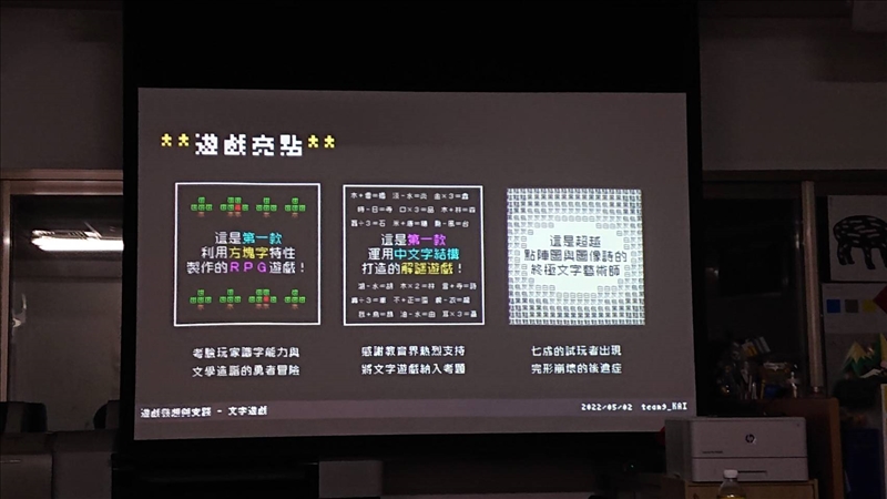 本次黃威愷先生跟學員們聊到了許多在諸如作品的發想歷程、團隊製作方向的把控、配合作品特性的行銷方針等等,黃威愷先生透過與組員聊天的形式,分享了許多他在製作《文字遊戲》所學到的經驗,例如在侷限下深入雕琢事務,《文字遊戲》便是在僅僅只能用文字呈現所有內容的侷限下,將文字所能乘載的玩法雕琢到極致;以一個核心去考量所有設計,沒有理所當然的設計,所有設計都要有明確的意義;在宣傳與產品內控制消費者的期待,在超出預期的內容展現時,能收獲更多的反饋等等。