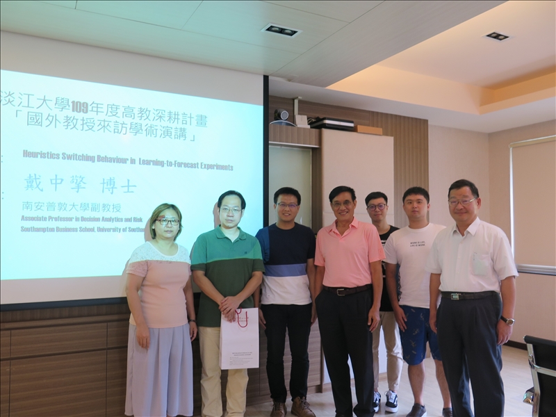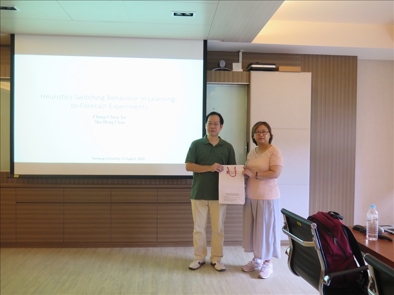 本次邀請英國University of Southampton副教授戴中擎博士介紹最新的研究成果,講題為Heuristics Switching Behaviour in Learning-to-Forecast Experiments (捷思轉換於學習預測行為之實驗)。由於文獻上將蛛網模型的價格動態歸因於人們在4種簡單方程式選擇的結果,此法顯然不符合一般的經驗,戴副教授希望能透過實驗證明人類行為是否真的可如此簡化,因此實驗的目的在於提供人們選擇模型與讓人們直接預測所產生兩種價格動態的教授。研究結果揭示如果限制人類選擇於少數2-4種模式的選擇,價格動態將明顯出現週期性循環,此與讓受試者自由選擇預測價格的動態結果並不一致。由於經過嚴謹驗證皆得到類似的結論,因此,將對此領域之視野拓展有顯著的貢獻。戴副教授的研究亦引起與會者之共鳴及興趣,例如,大家都很好奇為何行為模式,可以歸為少數幾類,這種方式就像數位影像,可透過三原色來呈現,但並不表示自然界真的只有三原色。戴副教授追求實事,為探求真理所做的貢獻也令與會者收獲滿滿。