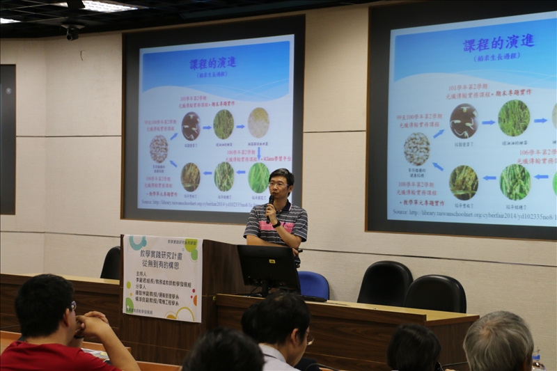 接著,由楊淳良老師分享其執行教學實務研究中的經驗。楊老師以稻米的生長過程來比喻光纖傳輸實務課程的演進,從99年學年度至108學年度,最初以傳統的講課方式,到增加期末專題的實作、加入iClass學習平台的輔助,至今在課程中加上單元專題實作,讓學生們進到實驗室作實驗,經過多次的改良,這門課程受到學生們的喜愛,而此門課程的教學實務研究計畫也受到委員們的肯定。楊教授認為每位老師的課程都像是種子,隨著教學時間的演變,會有不同的想法,可以適當改變與修正。