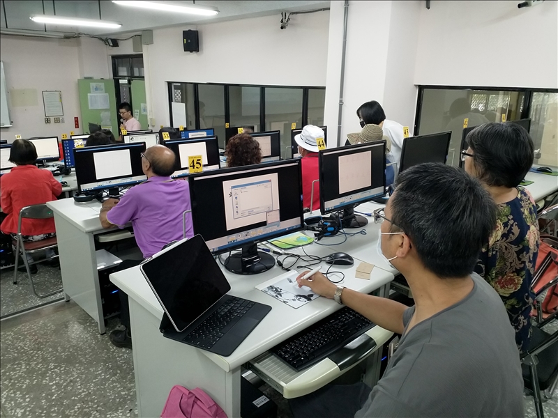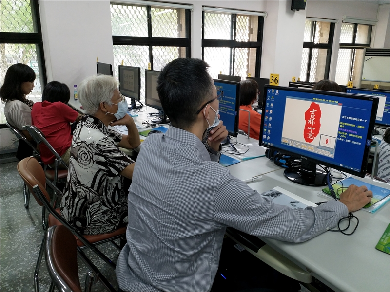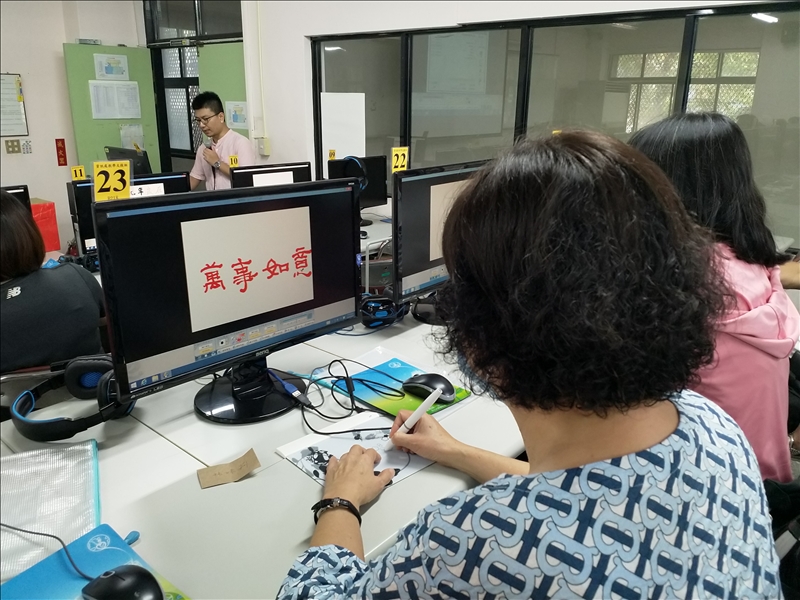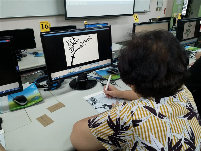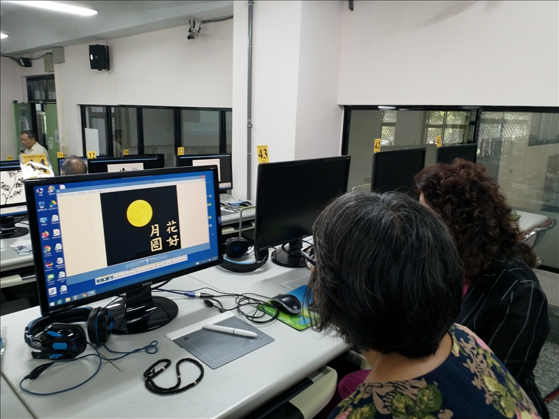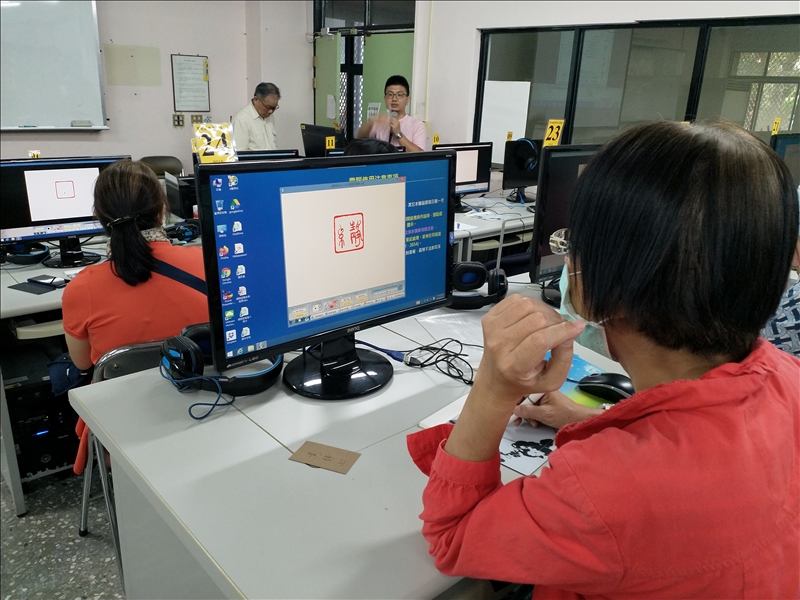 絲老師簡報結束後,再讓學員分批至B218電腦教室實際進行數位e筆的體驗。對於都是書法高手的學員來說,使用e筆來寫書法是一件很新鮮的事,一開始略顯生疏,但熟悉系統的操作後,馬上可展現書法的書寫功力,甚至治印及繪畫也都有好的作品呈現。
