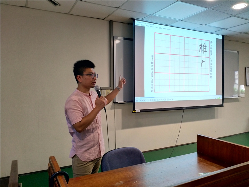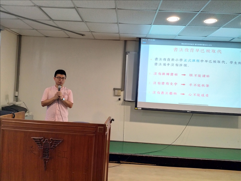 本次講座參與民眾踴躍,首先,在T110教室由文錙藝術中心張炳煌主任引言後,接下來由中文系絲凱郁老師主講,介紹目前學校體制下書法教學的正式課程已被取代,造成學生書寫、閱讀能力降低的情況,他如何藉由自行編製數位化教材,運用在小學的書法教學,引起學生對書法的興趣且讓學生便於自我學習。