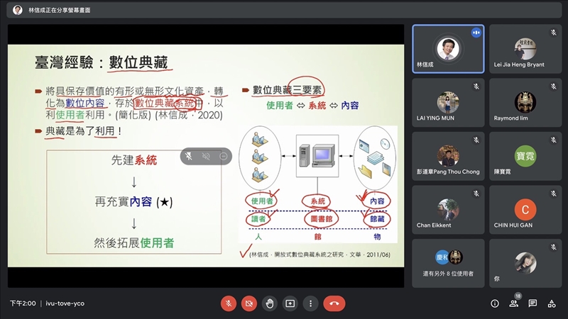 講座中,教授也介紹了數位典藏的概念,即透過數位系統,保存有價值的文化資產,以讓這些內容達到最有效的運動,即是數位典藏的三要素「人」、「館」、「物」。