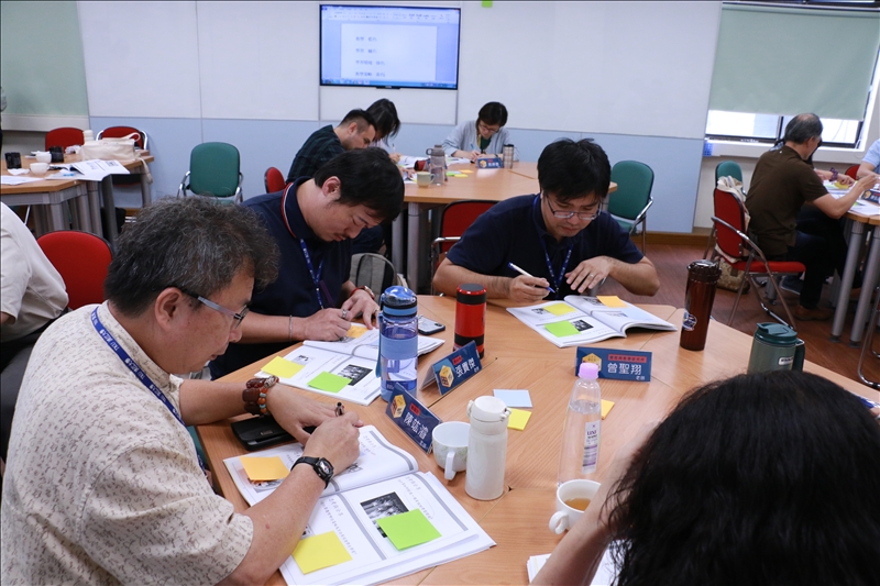 下午課程中,張老師談到以學習者為中心的教學要素。活動進行方式有大量的互動討論。張老師帶領新聘教師一同思考在過去經驗中,有哪些老師對自己的學習影響至深。接著,針對教學的看法、學習環境、教學策略方法…等問題進一步討論,將答案寫在便利貼上,並貼在白板上,讓每位教師都能看見彼此的觀點,拓展不同的思維。