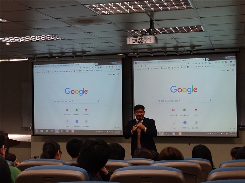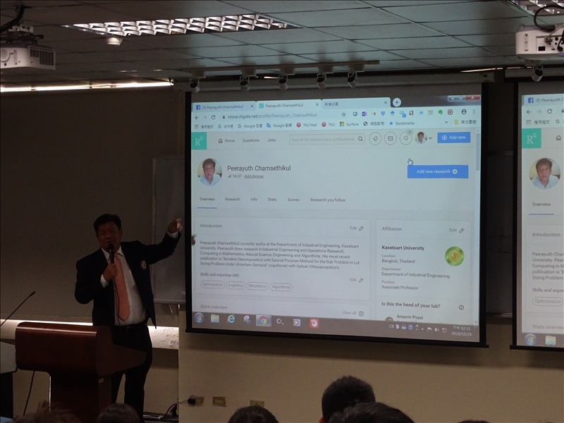 本次演講活動邀請泰國農業大學(Kasetsart University) 工學院長Assoc. Prof. Dr.Peerayuth Charnsethikul, Kasetsart的原意為農業知識兩字的組合,簡稱KU。Peerayuth Charnsethikul院長首先介紹位於曼谷的泰國農業大學為泰國最早創立的大學之一;並詳細介紹他們工學院各系所創立的順序,工學院共有十個系所,為全泰國最大的工學院。院長簡單介紹自己後,先簡單說明他們工學院現在正在做研究類型及相關產業,接著院長展示他個人專頁及FaceBook,板上包含了各個教授們研究的介紹影片,像是視覺辨識應用於軟殼蟹隻養殖、農業自動化機器人應用於有機農業上,同時也鼓勵同學要時時接觸新資訊,現在科技進步太快,這代年輕人較無時間來反映時代的變遷,同時以愛迪生與特斯拉為例來鼓勵同學從事工程技術之應用,因為愛因斯坦說發明家並非工程師。