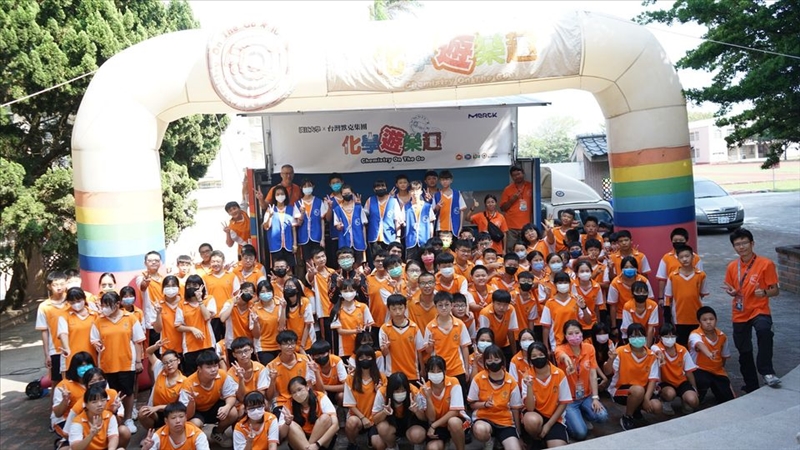 沿著快速道路往西開快50公里,這週在雲林的第三場活動來到雲林西邊的東勢國中,今天我們和全校的同學一起,上午聽化學的故事,下午看表演跟做實驗,學校安排了一個半圓形的場地給化學車停放和表演,是一個超讚的舞台區域噢 ! 因為化學遊樂趣團隊的工作服跟東勢國中的制服剛好是同一個色系,所以要開場表演前,從化學車的舞台看下去,整片橘色的看起來好漂亮啊 !