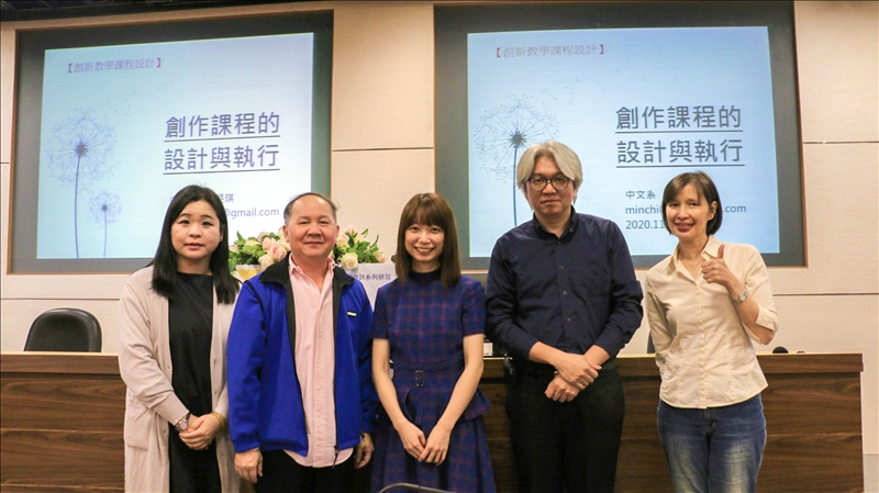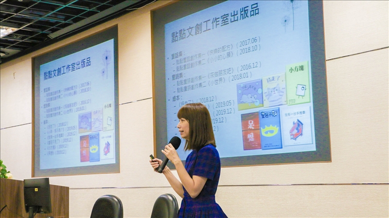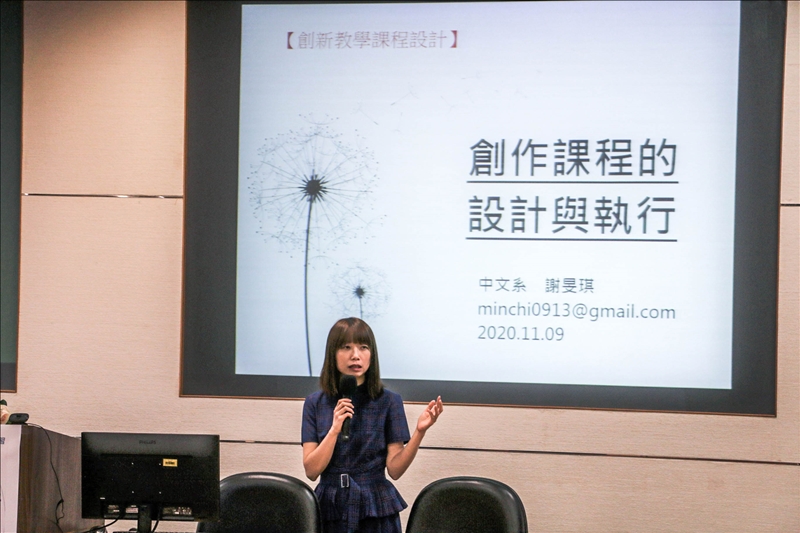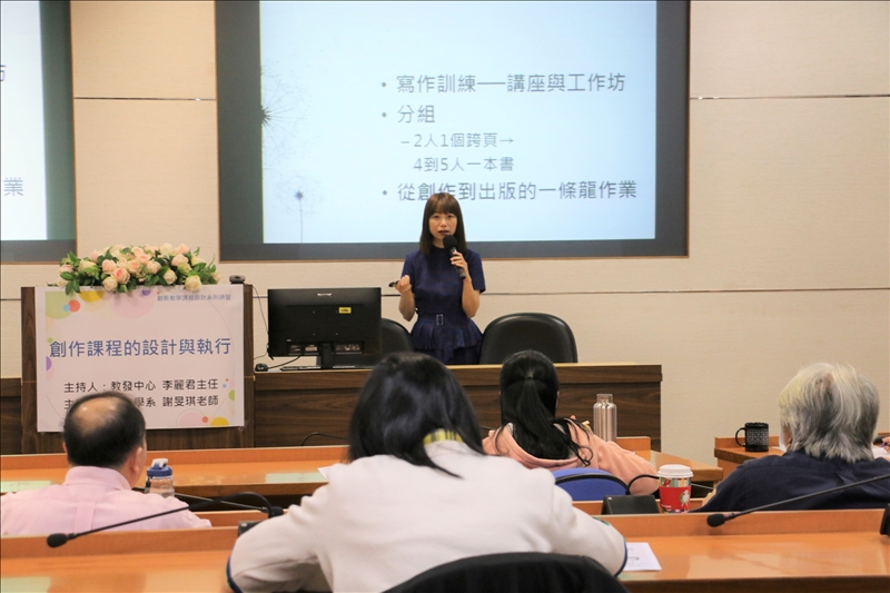 此次演講謝老師分享在創作課程中,以兒童文學為主題並請學生創作出童謠、童詩或是繪本,透過此種方式將中文系的專長以不同的形式展出,在激發學生創作的同時讓他們對於本科系的專長作出延伸。