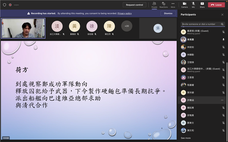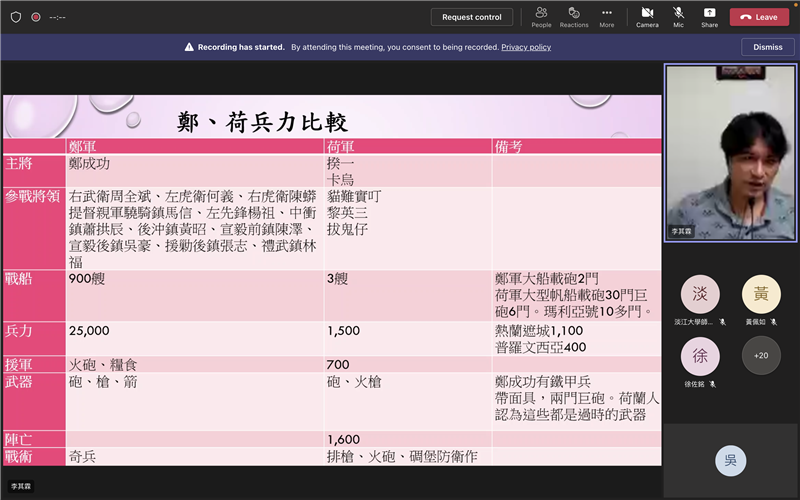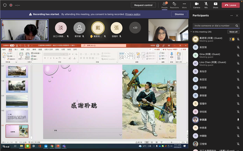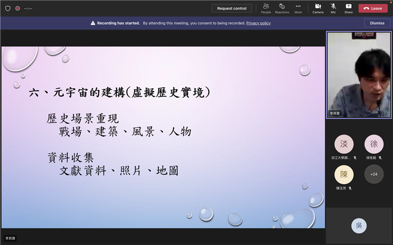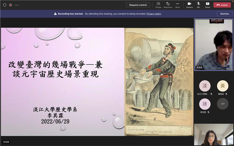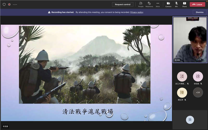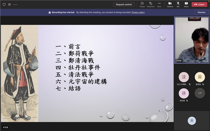 「淡馬文化e線牽USR計劃」這學期最後一場講座邀請到淡江大學歷史系副教授暨海洋及水下科技研究中心副主任李其霖老師作為我們的壓軸演講嘉賓。老師專長於台灣史、海洋史、口述歷史、清史、跟文創產業,他結合過去紮實的文獻基礎,向大家推演鄭荷戰爭、鄭清海戰、牡丹社事件、清法戰爭這幾場戰事的來龍去脈,內容鉅細靡遺,讓大家彷如親臨其境。對於元宇宙目前的發展,李其霖老師認為該領域雖然有非常多元的潛力,但如果要在虛擬世界中打造實境體驗,尤其是要還原歷史現場,那麽資料的考證絕對不可馬虎。他也分享自己過去的研究成果,透過文獻、照片、地圖中所提示的資訊,在圖像化的過程中才能更完美地刻畫戰場、建築、風景、人物等細節。