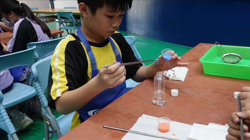 今天除了「黯黑神畫」之外,我們還帶同學玩了「碳黑急急棒」跟「七彩小蝌蚪」,黯黑神畫是透過碳黑粒徑調整出不同深淺的黑度墨水來作畫,看起來一片黑的紙上可以看到另一個黑所畫出來的字樣,有同學一開始搞不清楚狀況,以為是隱形墨水,結果墨稍微乾一些之後,兩個不同黑度的差異馬上顯現出來,結果,原來畫的是同學的臉。連名字都寫上去了,我們知道你們很要好啦!真的不用這樣告白噢!