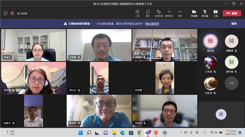 主席莊希豐行政副校長於致詞中感謝中心歷年來所做的議題與分析,提供數據參考,給學校帶來很大的幫助。藉由中心張德文主任簡報說明目前中心開放12項校務研究資料庫可提供教職員申請分析研究、校務研究分析平台的操作方式,及視覺化模組的內容說明及運用方向。與會老師於線上會議回饋,感謝如此清楚的數據提供。希望藉此可以更推廣大家申請資料庫的應用。