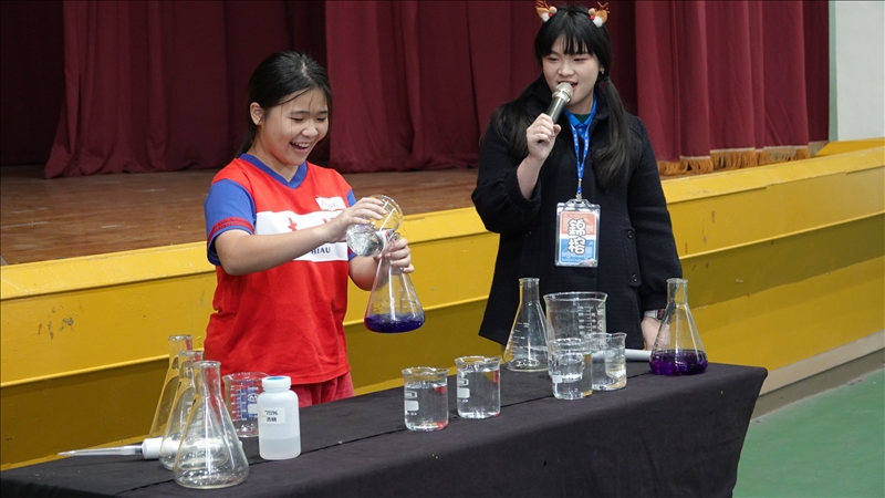 早上用問答的方式開啟了故事時間,讓同學們了解輻射是什麼,還有輻射在哪裡,以及關於輻射的防護跟應用。其實輻射在生活中無所不在,有沒有發現輻射沒有我們想像中的這麼可怕啦~下午的化學魔術秀,從一開始同學們就非常踴躍,只要聽到「找人上台」的關鍵字,就會挺直手臂,希望我們能夠請他上台。有位同學在倒水的橋段時,看到水離我們指定刻度還有一點點差距,就拿起了微量吸量管想要慢慢加水到刻度上,細心程度以及求精準的態度很適合來化學系,希望之後能在化學路上看到你~而在實驗關卡時更能體會到同學們的聰慧,台上的講師問的問題不僅能回答,還能舉一反三,你們真的超厲害的~