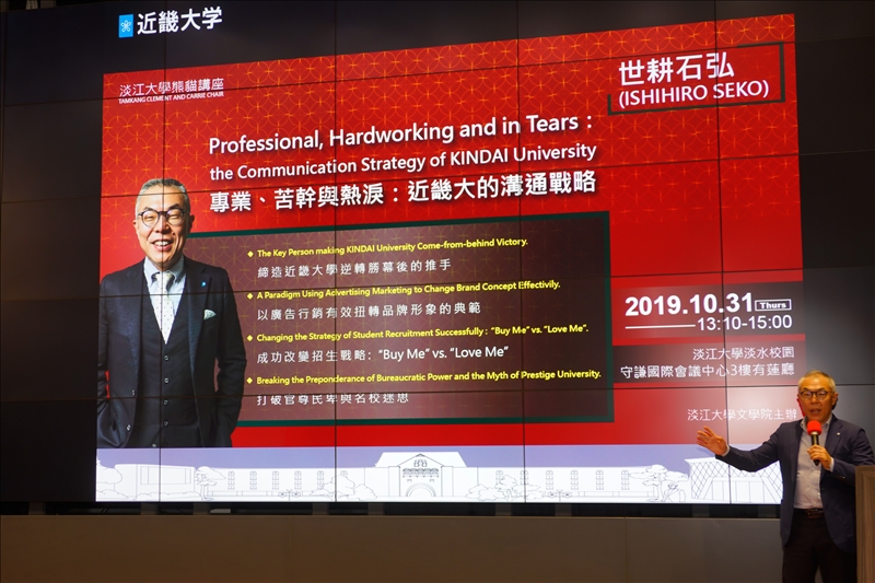 本次演講由日文系副教授蔡佩青即席翻譯,整場演講中世耕石弘幽默生動的內容讓場內師生掌聲連連。他表示,為了讓更多人認識近畿大學,以廣告行銷的方式讓更多人關注,如每次活動結束後會麗及製作精彩的影片在網路播放、各種採訪的精心設計等,都是增加讓別人知道和認識近畿的機會。