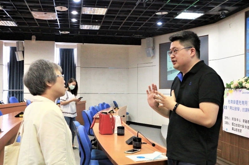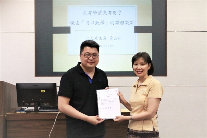 教發中心於109年 11月19日邀請國立台灣大學外國語文學系黃山耘老師,進行「先有學還先有用?探索『用以致學』的課程設計」教學經驗分享,黃老師曾榮獲105年台大教學傑出獎,此次演講除了展示自己對教學的熱忱與詼諧的個性外,並分享在外語課程上他獨到的教學設計理念。