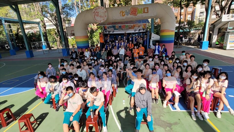 化學遊樂趣今天移動到市區,來到位於高雄鳳山區的五甲國中,學校把風雨操場空出來讓化學車停放跟變形,在表演前還請總務處搬來輕便座椅讓同學能坐在椅子上看表演,後來發現可能坐太擠,就乾脆讓小助手群坐到活動式的階梯看台上,化學車前面看起來比平常更像一個舞台區域,前面是坐椅區,後面是看台區,真的很酷 !
