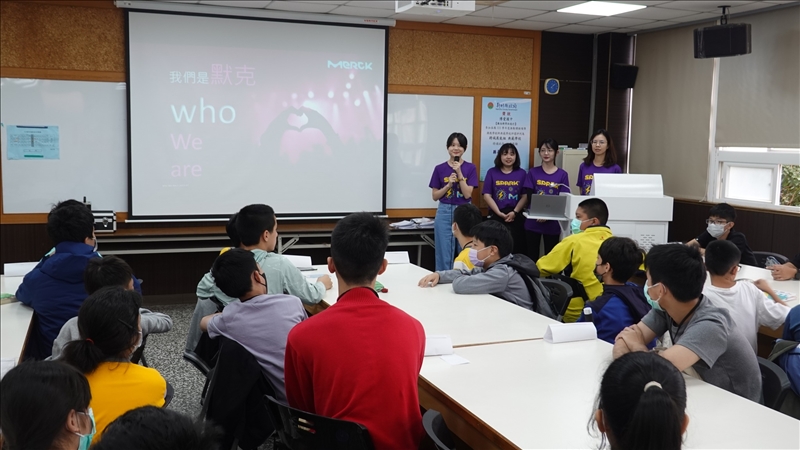 上午一開場,先由台灣默克的志工們自我介紹,他們除了介紹自己來自什麼部門,以及他們工作的內容,甚至還有他們求學時的科系,這麼大一間的科技與製藥公司,果然是什麼樣的人才都有,除了大家都猜到的化學化工背景之外,還有出自於心理系的高材生呢,今天來的志工都是女性,台灣默克希望讓參加的同學們知道,性別不是成就的框架,任何人只要努力都可以在工作上有很好的成就。