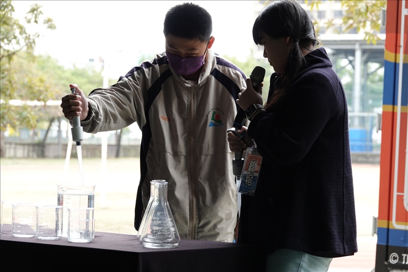北部好冷喔 ! 而且那個冷鋒居然跟著化學車往南跑,化學遊樂趣團隊原本以為可以稍微在南部享受一下陽光的,沒想到我們都已經來到臺南市了,氣溫還是冷颼颼,而且還下雨 ! 所以雖然今天化學車開到了海佃國中,但是那個舞台沒有機會打開來,我們在風雨操場和海佃國中八年級三個班的同學一起玩樂化學,今天除了表演之外,還做了麵麵相趣、碳黑急急棒和三碘一刻這三個實驗。