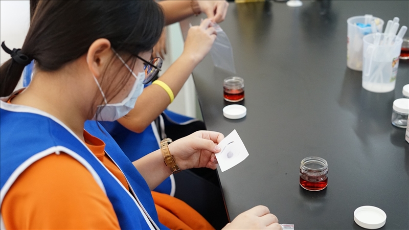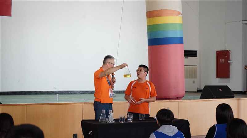 下午的六色彩虹橋表演上台的小幫手都特別逗趣,介紹容器時也用網紅的手勢呈現讓底下同學看的清楚。而有位同學可能覺得微量吸量管一次能吸的量太少了,就拿著兩支同時吸水,真的很有才!後續的三場實驗帶來的是碳黑急急棒、麵麵相趣和美味ABC,虎尾的學生們做實驗都玩的非常起勁。在麵麵相趣這關,有幾位四色色素全加讓麵糰變黑色;而揉麵團揉的非常起勁,桌上全是粉的倒也有不少。我們的小助手也是幫各位洗罐子洗的特別累,辛苦你們啦~