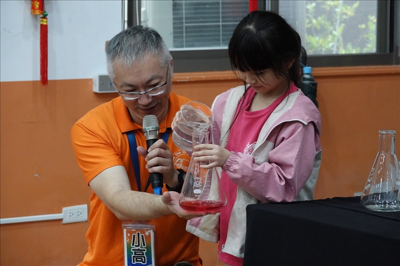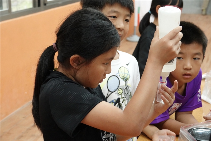 國小的孩子總是帶點頑皮與純真,做實驗時只要講到的名詞有其他的諧音都會狂笑:例如「杯壁」想成「卑鄙」等等。也遇到有人拿到實驗器材就開始玩個不停、有人把碳黑筆畫到了額頭上(雖然樣子很可愛)。但也是他們給予了我們最熱烈的回應:回答問題舉手的踴躍、表演時台上的互動、做實驗積極度都超級棒的。很感謝各位小朋友的「合作」,希望你們也帶著滿滿的收穫回家!
