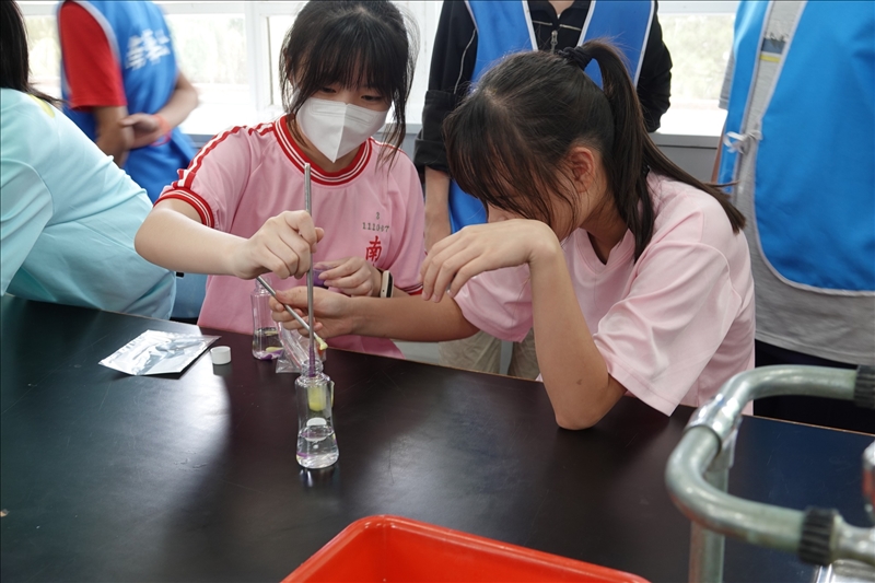 就這樣我們在草地上開啟了表演,到了錐形瓶變色橋段時,我們找了一位女同學上來,不免俗地問了問題想讓同學把思緒灌進瓶子裡,我們問到在學校裡有沒有喜歡的人呀,同學一開始矢口否認,台下的同學們紛紛發出「異議」的聲音,直到同學把水倒入錐形瓶哩,變成浪漫紫色,同學才笑的眼睛彎彎的點頭,哎呀那個神情真的太甜蜜啦~雖然這都是我們設計出來的橋段,可是真的命中的時候都會有種驚喜感。表演結束後大家帶著雀躍的心情前往實驗室,有可能剛剛表演的熱情還沒退卻,進到教室時還很嗨XD,但可能有冷氣的加持,同學們慢慢地靜下來,聽完老師講的步驟後就開始動手做,每個步驟都非常仔細,深怕自己一個手抖就壞了作品,還有看到同學在打草稿時參考了象形文字,真的深藏不露!