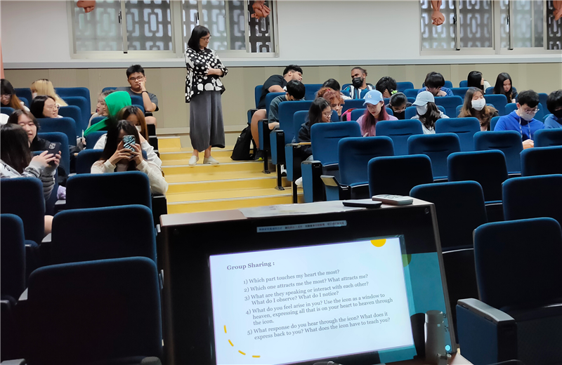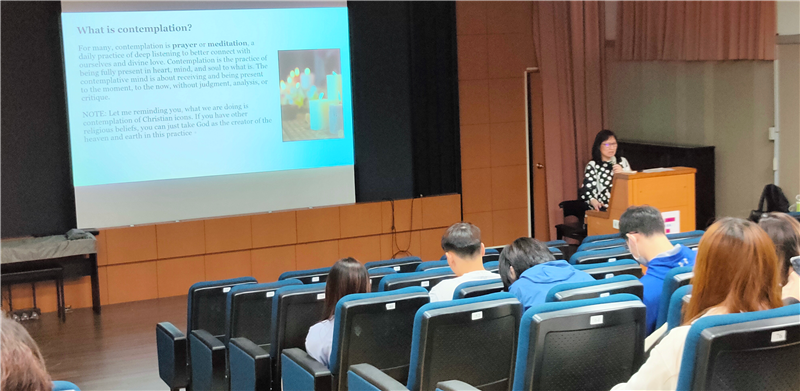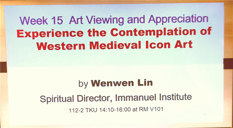 歐洲文化藝術行旅:藝術與觀看」單元,特邀專家帶領現場體驗,如何通過觀看,來探索作品的象徵和指涉。內容包括 (一)甚麼是聖像畫的默觀? (二)步驟說明 (三) 實際體驗 (四)分享及討論。演講人首先簡要說明了圖像默觀的由來, 接著透過一「破冰」的團體活動,幫助同學熟悉如何觀看一般圖片,藉由分享外感官對作品的感知,逐一進入內感官。在小組討論、分享及為圖片命名的過程中,開始明白圖像觀看意涵。當正式進入主題觀看(以Duccio 之Maestà為例),以及進一步默觀時,已然能建立與作者及其創造畫面,乃至畫中故事人物間的關係想像之中,是一次對西洋中世紀圖像藝術切身體察的難得經驗!雖仍有不解,但已引發好奇及興趣,可供進一步探究。