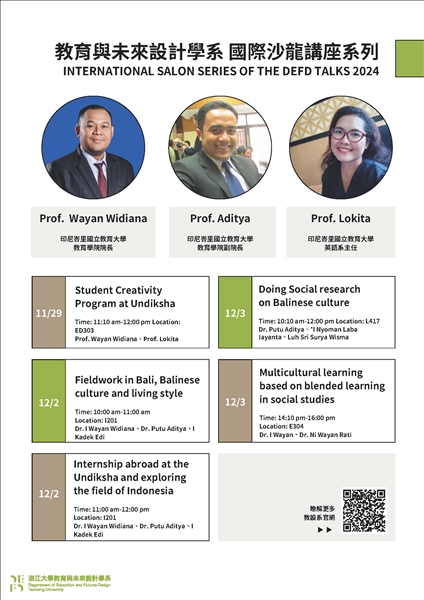 本場專題講座由印尼峇里國立教育大學Universitas PendidikanGanesha教育學院院長Dr. I Wayan Widiana、副院長Dr. Putu Aditya Antara及I Kadek Edi Yudiana老師主講,主題分別為「Fieldwork in Bali, Balinese culture and living style. 在峇里島的田野調查,峇里島文化與生活方式。」及「Internship abroad at the Undiksha and exploring the field of Indonesia. 印尼Undiksha大學的海外實習與探索印尼領域。」