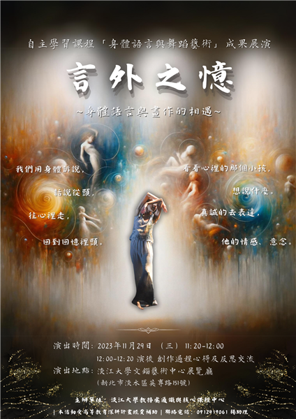 2023年,淡江首次自主學習課程「身體語言與舞蹈藝術」,將在文錙藝術中心展覽廳,為各位帶來我們第一場成果展演—《言外之憶》。同學們將以身體語言為筆,以「畫外之寓/域:形式所寄託的不可遺忘之事」畫展所得感觸為墨,書寫源於心中的「言外之憶」。我們將「訴說」那些曾深埋於心的情與念;邀請您,「聽聽」,我們的「言外之憶」。