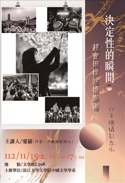 配合本學期課程綱要以「藝文作家採訪及採訪文稿撰述」為主軸,邀請業界知名講師蒞校以「採訪攝影實務」為題發表演講。