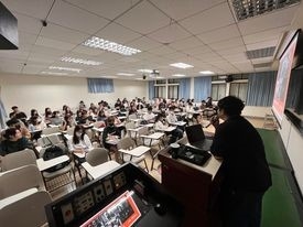 演講中講者也播放了許多個人代表性的作品,並從作品內容分析工作流程與常見意外事項,在綠幕特效和古裝武打的專業經驗,更是吸引同學專注聆聽,這也是台灣影視產業較少機會接觸的創作內容。