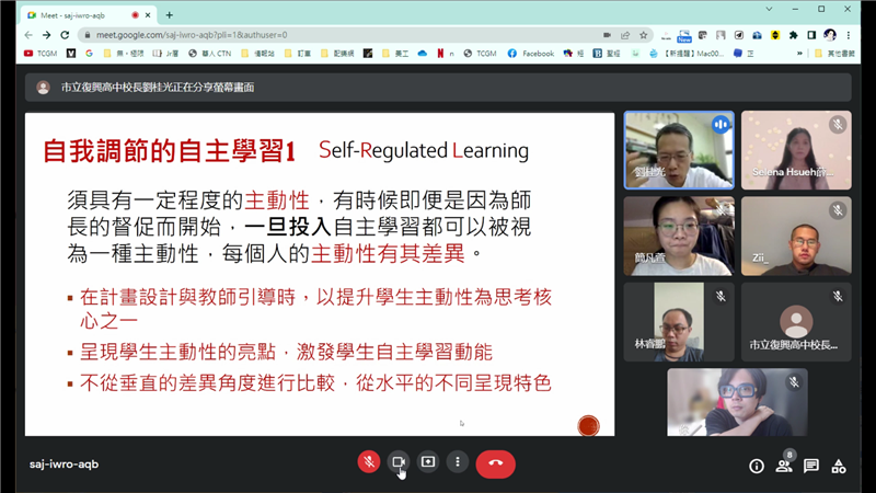 最後校長分享了復興高中的尋夢計劃網站,裡面找了很多業師來錄製影片聽到學生們看見工作現場真實的樣態,也設計了自主學習自我評量檢測表,而根據統計顯示45.5%的學生表示實際計劃與進度無法配合,希望學校能夠提供更多自主學習的資源,包括網站、相關書籍,而未來目標是持續幫孩子建構一個不斷自我調節成長進步的自主學習系統。